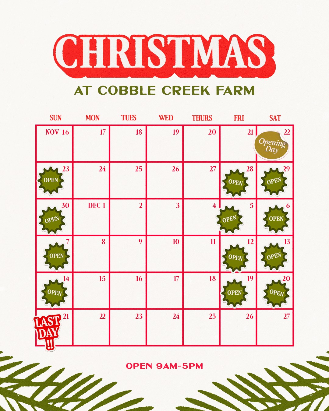 Christmas Trees: Friday, Saturday & Sunday in late November & December 9 am to 5pm (last wagon to tree field leaves barn at 4pm sharp)